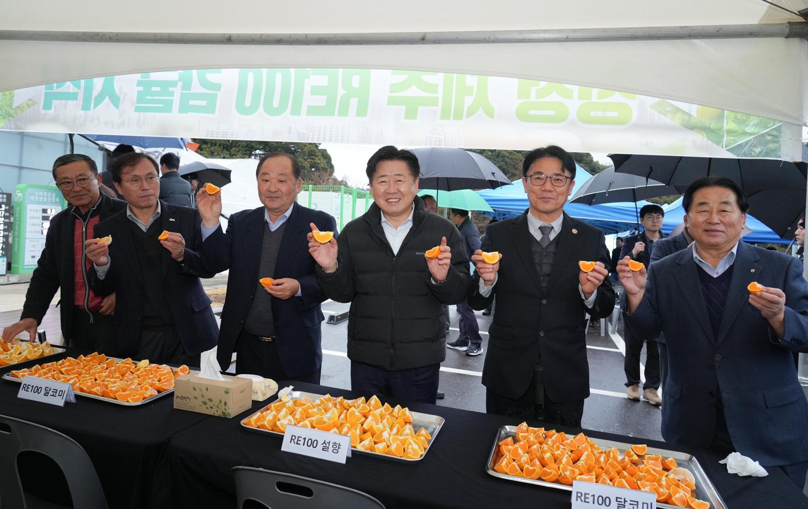 오영훈 제주도지사는 “RE100 계란과 우유가 한전의 녹색 프리미엄 재생에너지를 구매해 쓰는 방식이었다면 RE100 감귤은 비닐하우스에 직접 발전 설비와 히트펌프, ESS를 운용했다는 점에서 큰 의미가 있다”며 “전국 최고 수준의 감귤 생산 역량에 RE100까지 뒷받침해 제주 농업 5조 원 시대를 열 것”이라고 했다.