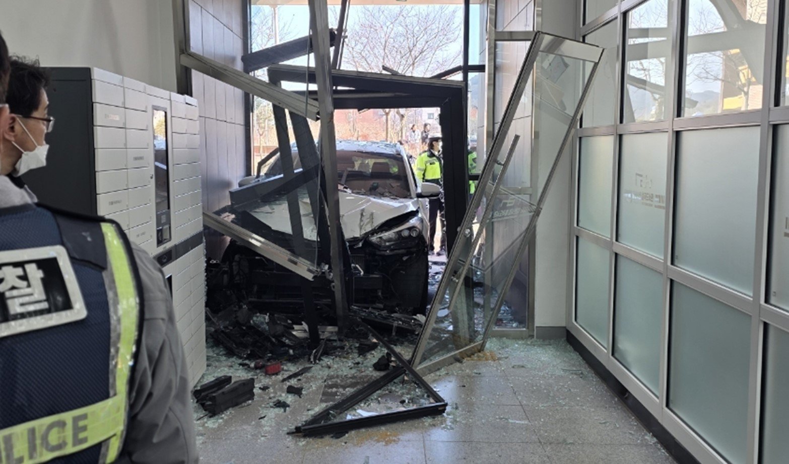 소방 당국이 공개한 사진에서 SUV 차량은 도서관의 출입구를 부순 채 세워져 있었다. 차량 범퍼 등도 파손돼 주변이 어지럽혀진 상태였다.