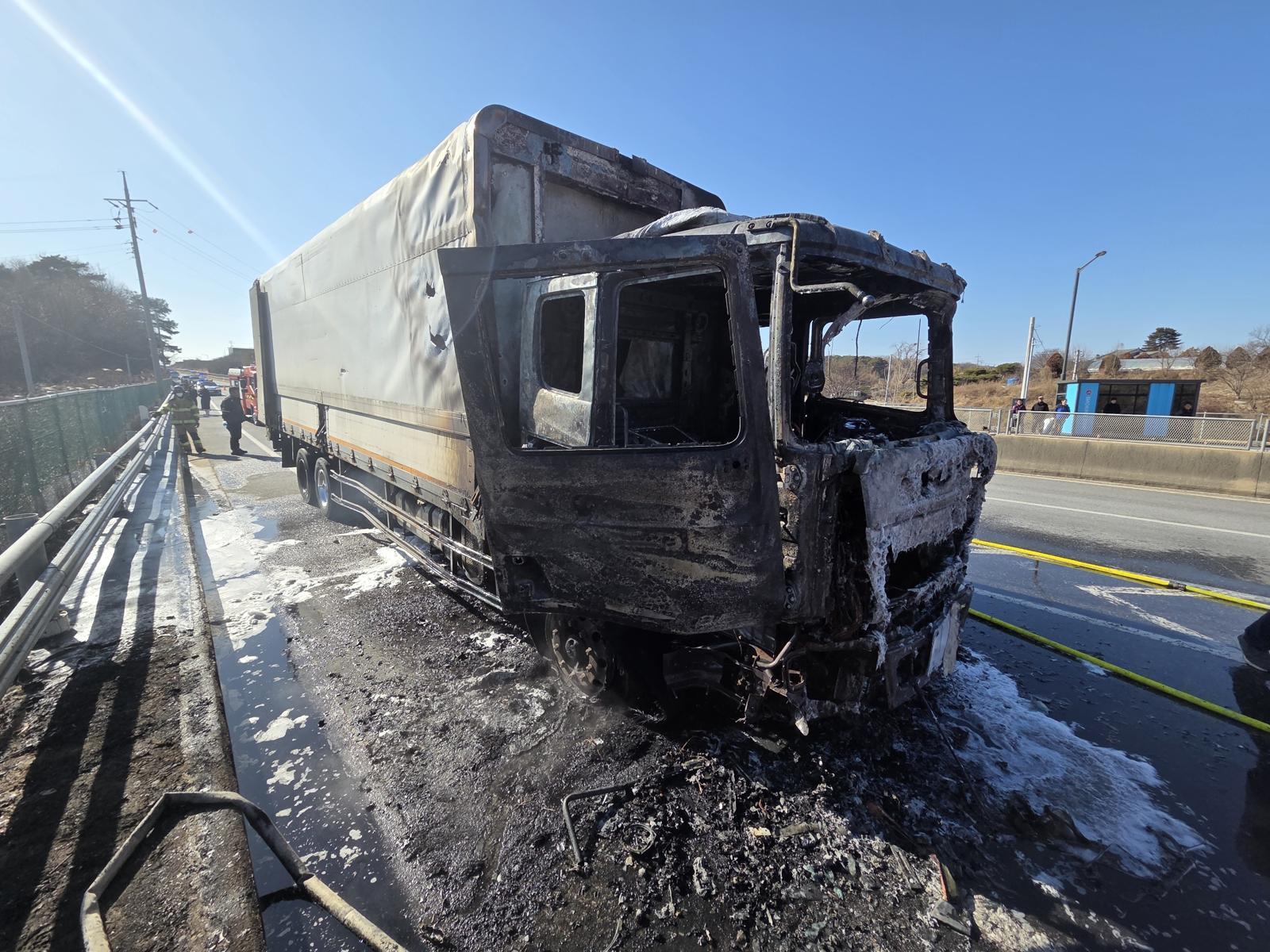 27일 오후 1시 19분께 충남 논산 노성면 공주 방향 23번 국도에서 주행 중인 8.5톤 윙바디에 불이 났다.