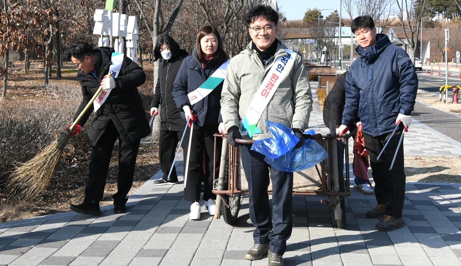27일 경북 안동시 풍천면 도청 앞 천년 숲에서 직원들이 청소용 손수레를 끌고 있다. 이날 경북도 7개 부서 직원 40명이 새해맞이 환경 정비를 실시했다.