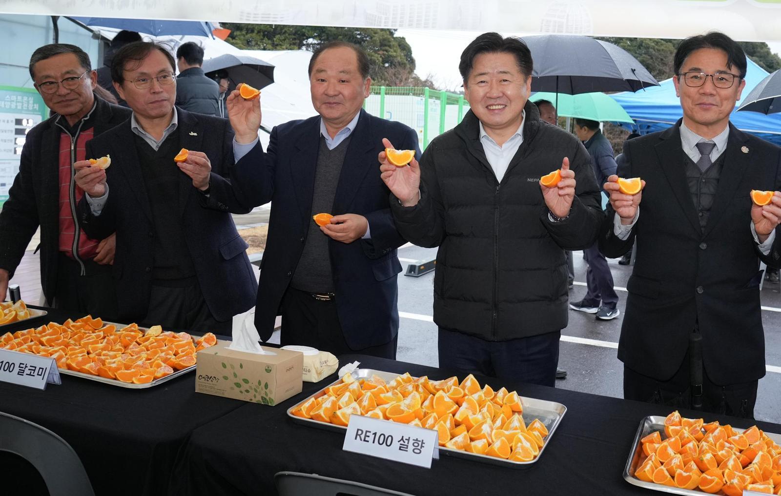 오영훈 제주도지사는 “RE100 계란과 우유가 한전의 녹색 프리미엄 재생에너지를 구매해 쓰는 방식이었다면 RE100 감귤은 비닐하우스에 직접 발전 설비와 히트펌프, ESS를 운용했다는 점에서 큰 의미가 있다”며 “전국 최고 수준의 감귤 생산 역량에 RE100까지 뒷받침해 제주 농업 5조 원 시대를 열 것”이라고 했다.