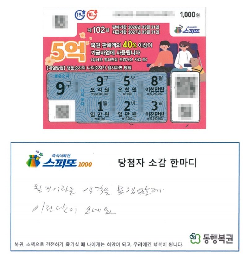 해당 사연은 27일 복권수탁사업자 동행복권 공식 홈페이지에 올라온 ‘스피또1000 102회차’ 당첨자 인터뷰 글을 통해 알려졌다.