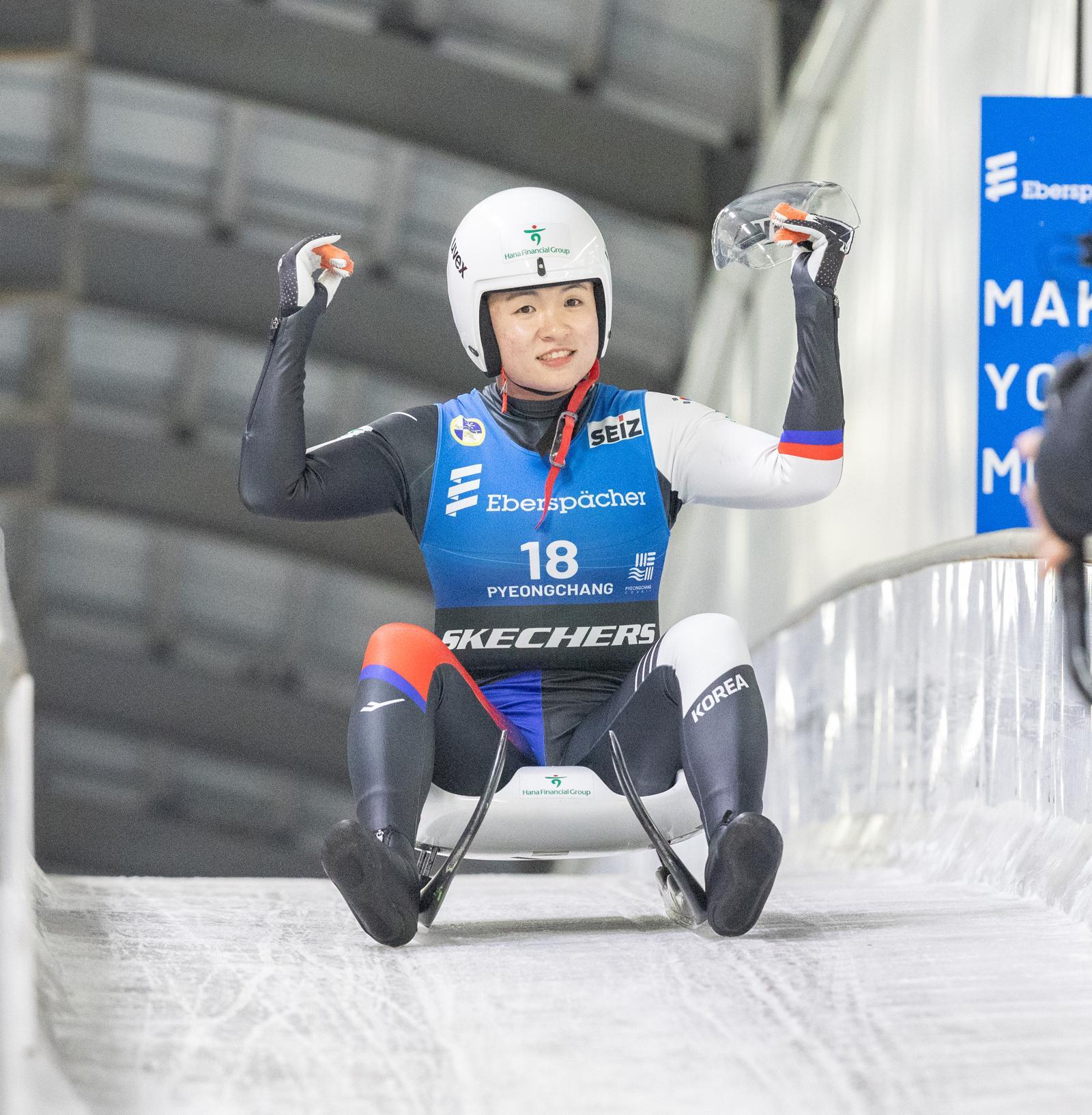 한국 루지 여자 1인승 국가대표 정혜선이 지난해 강원 평창군에서 열린 국제루지연맹(FIL) 월드컵에서 완주한 뒤 두 팔을 들어 올리며 미소 짓고 있다. 대한루지경기연맹 제공