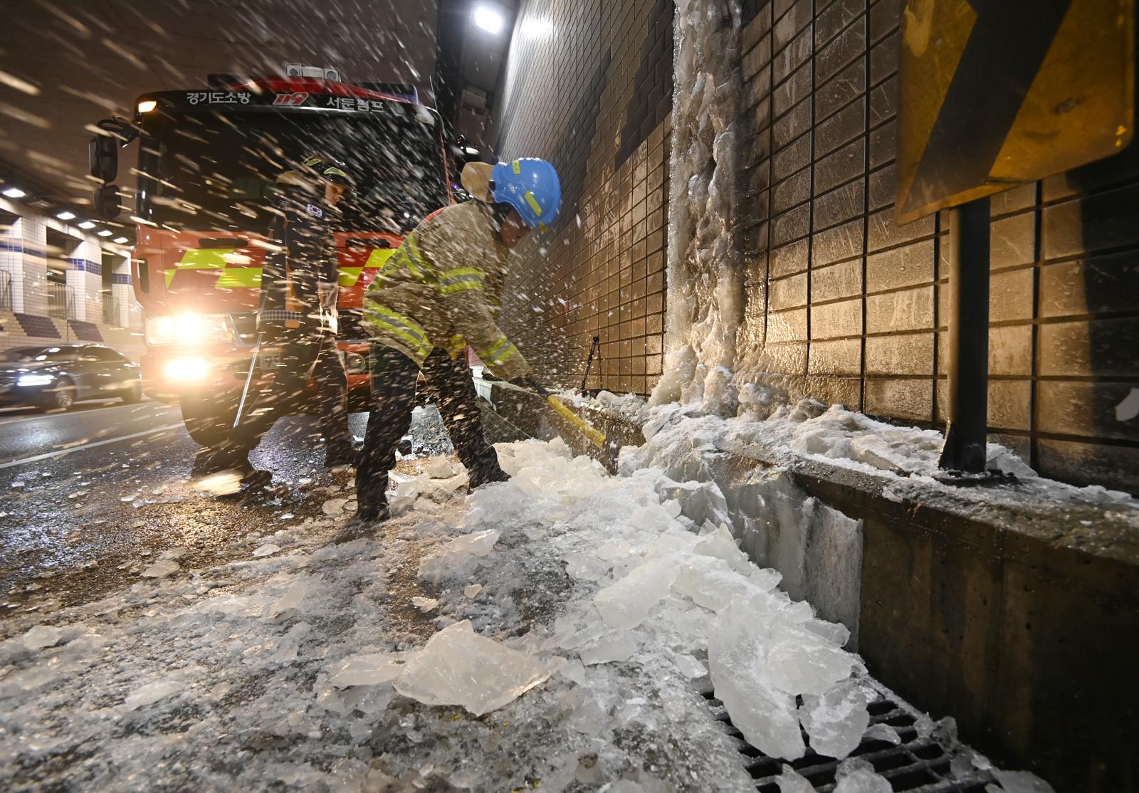 강추위로 동파 피해가 이어지고 있는 27일 경기 수원시 팔달구 화서지하차도에서 소방대원이 결빙된 대형 고드름을 제거하고 있다. 2026.01.27. 수원=뉴시스