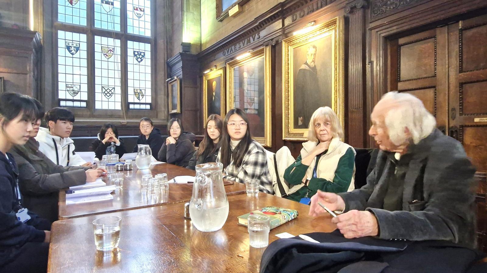 최근 옥스퍼드대 밸리올 컬리지에서 달성교육재단 연수 참가 고교생들이 데니스 노블 교수의 특강을 듣고 있다. 달성군 제공