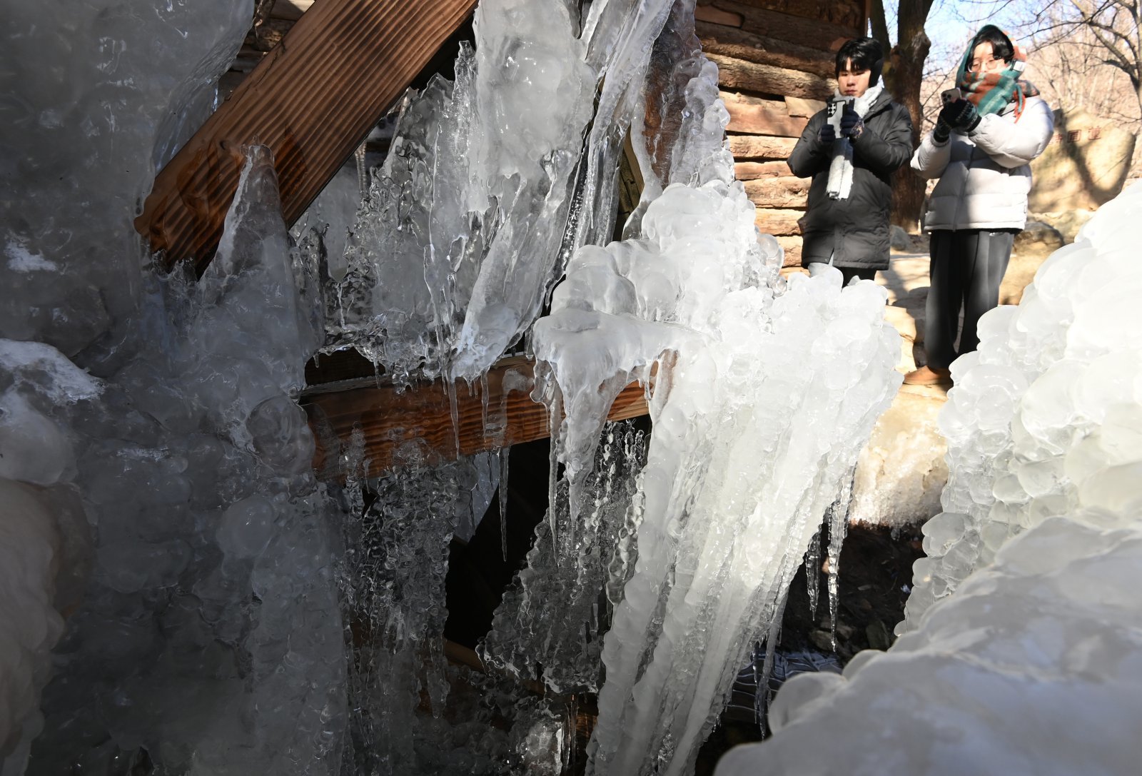 전국 곳곳에 한파특보가 발효된 28일 경기 용인시 한국민속촌에 설치된 물레방아가 꽁꽁 얼어 있다. 2026.01.28 뉴시스