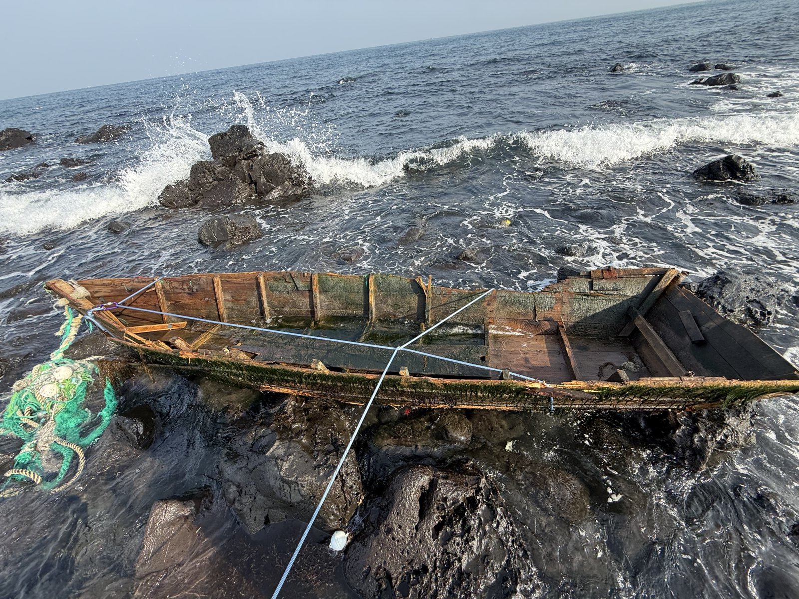 29일 오전 제주시 애월읍 해안가에서 정체불명의 목선이 발견됐다. 제주해양경찰서 제공