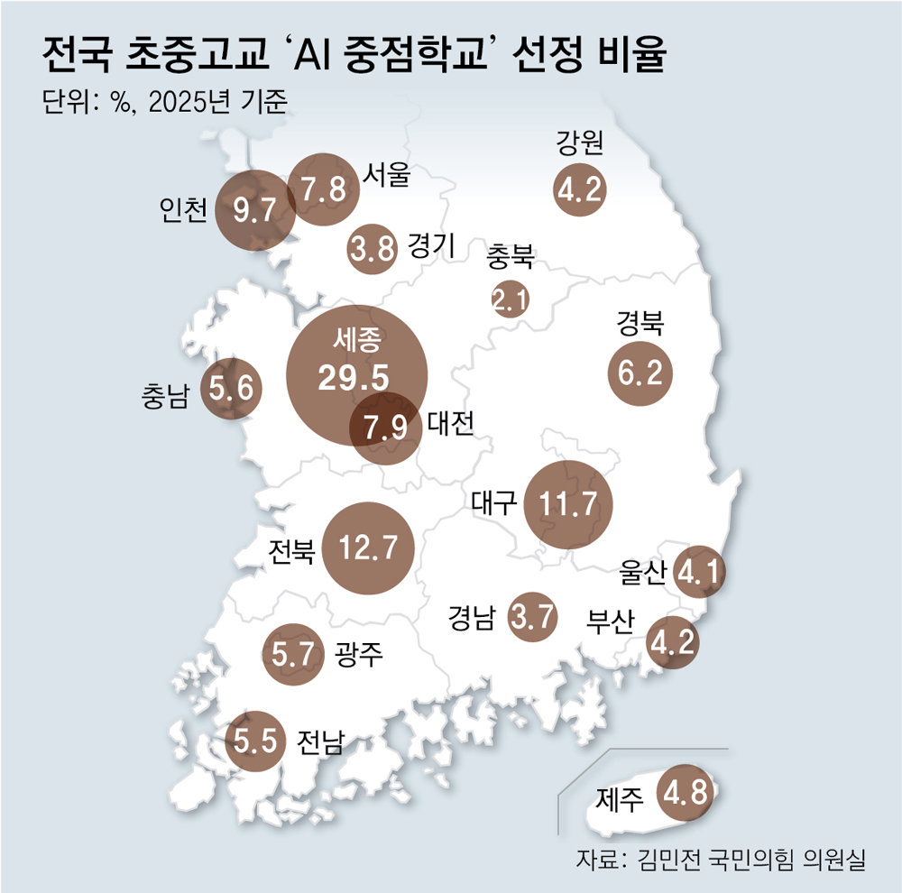 반면 충북은 470개교 중 10곳(2.1%)만 AI 중점학교로 선정됐고 경남(3.7%), 경기(3.8%) 등도 비중이 낮았다. 지역별로 AI 중점 교육 편차가 최대 15배 가까이 나는 것이다.