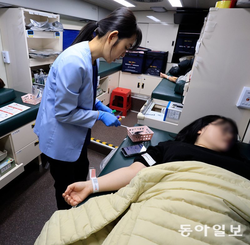 29일 광주 남구 공무원들이 구청을 찾은 헌혈 차량에서 헌혈하고 있다. 이번 단체 헌혈은 기온 하락과 겨울방학 등 헌혈자가 급감하는 겨울철을 맞아 이뤄졌다.