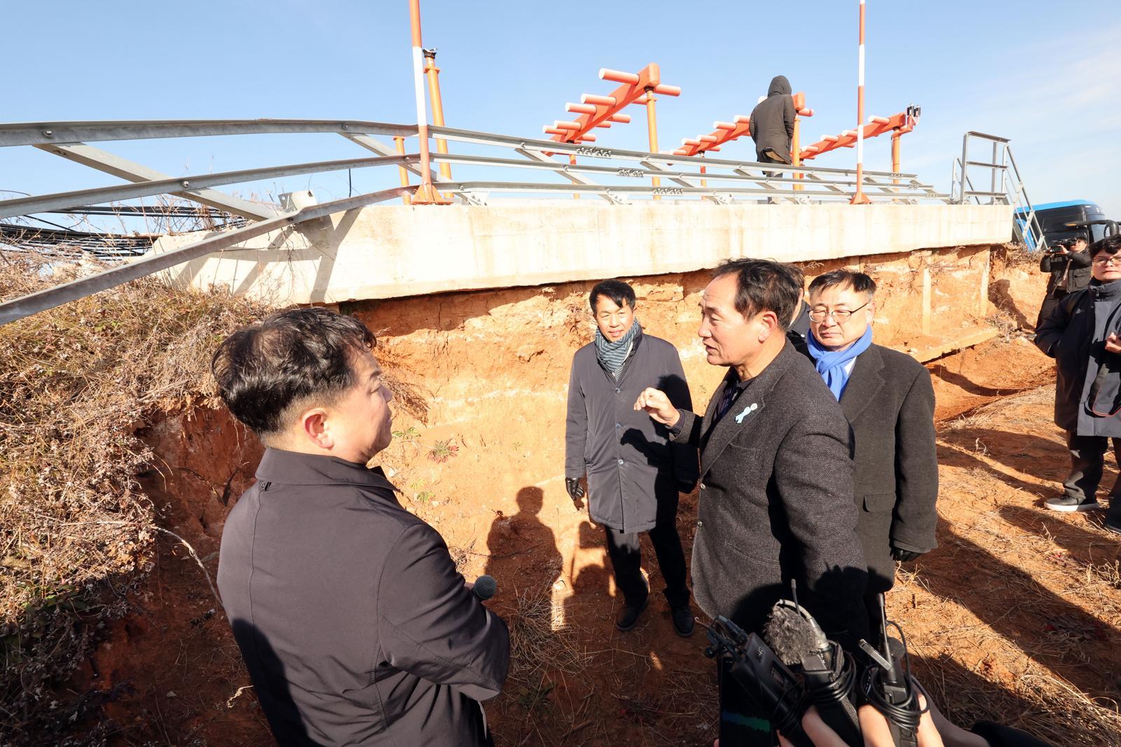 20일 무안국제공항에서 열린 12·29 여객기 참사 진상규명을 위한 국정조사 특별위원회 현장조사에서 위원들이 로컬라이저 관련 질의하는 유가족에 발언을 경청하고 있다. 뉴스1