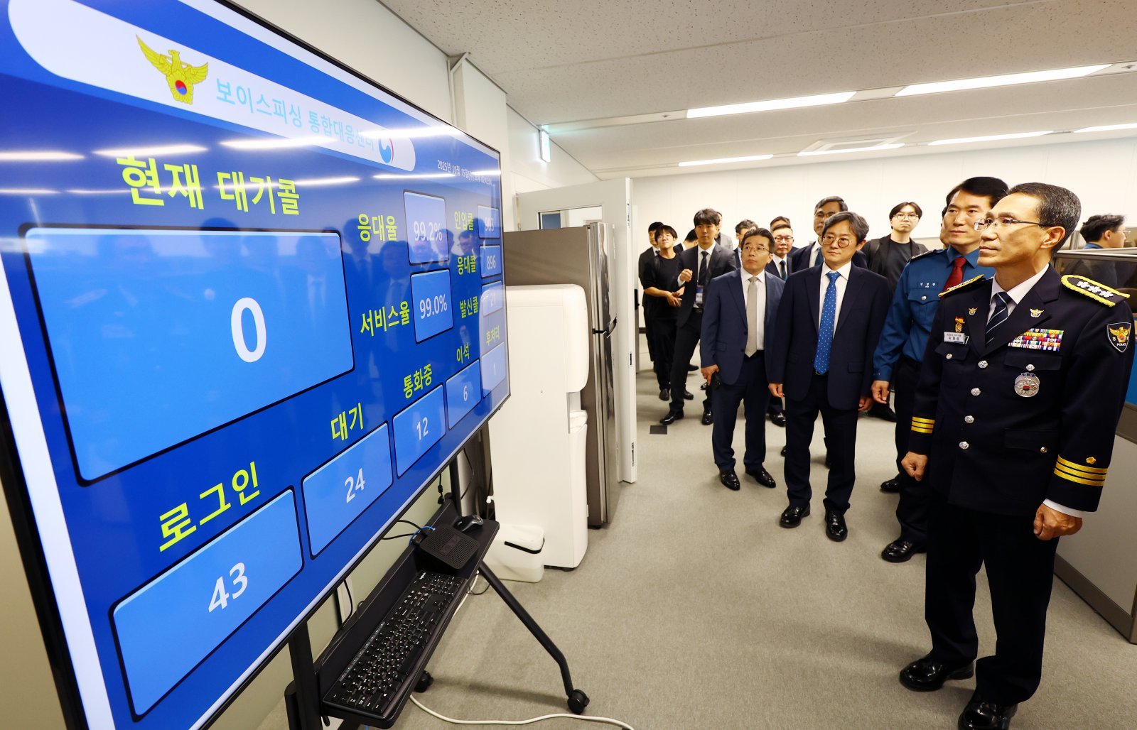 유재성 경찰청장 직무대행을 비롯한 참석자들이 15일 오후 서울 KT광화문 빌딩 WEST에서 열린 범정부 합동 전기통신금융사기 통합 대응단 개소식에서 신고대응센터 상담팀을 둘러보고 있다. 2025.10.15 뉴시스