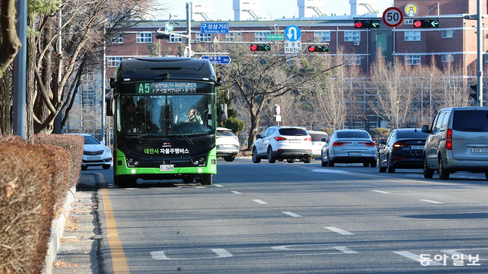 지난달 29일 대전 유성구 자율주행 시범운행지구 일대에서 자율주행 버스가 승객을 싣고 달리고 있다. 김태영 기자 live@donga.com