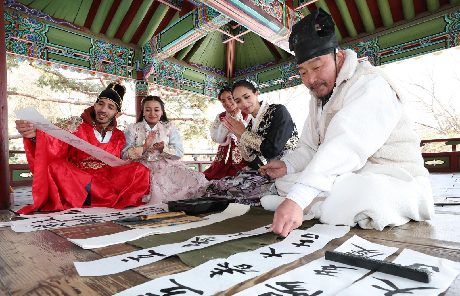절기상 입춘을 이틀 앞둔 2일 경기 용인시 한국민속촌에서 외국인 관광객들이 입춘첩 쓰는 모습을 지켜보고 있다. 입춘첩은 입춘을 맞아 복과 길운을 기원하며 대문 등에 붙이는 글귀다.