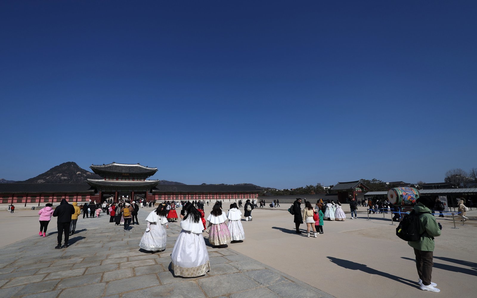 서울 낮 최고기온이 2도를 기록하며 영상 기온을 회복한 1일 서울 종로구 경복궁에서 관광객들이 경내를 관람하고 있다. 2026.02.01 뉴시스