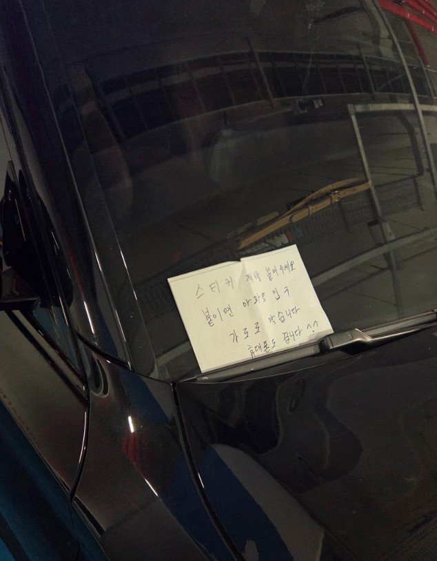 실제로 차량에 부착된 메모에는 ‘스티커 제발 붙여주세요. 붙이면 아파트 입구 가로로 막습니다. 휴대전화는 끕니다^^’라는 문구가 적혀 있었다.