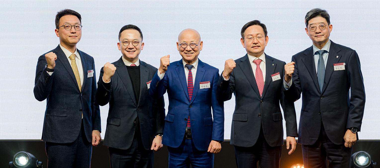 2일 전북 전주시 그랜드힐스턴 호텔에서 열린 고려대의료원 교류 협력 대자인병원 출범식에서 이병관 대자인병원 이사장(가운데)과 윤을식 고려대의료원 의무부총장(오른쪽에서 두 번째), 한승범 고려대 안암병원장(오른쪽) 등이 기념사진을 찍고 있다. 대자인병원 제공