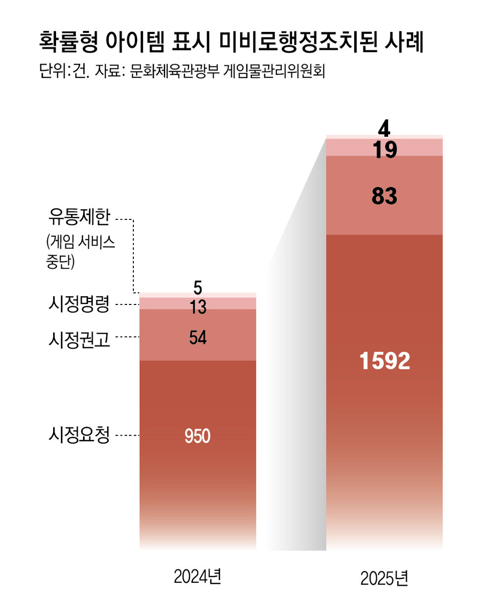 3일 문화체육관광부 산하 게임물관리위원회(게임위) 자료에 따르면 2024년 3월 개정 게임산업법 시행으로 뽑기 확률 공개가 의무화된 이후 지난해 12월까지 관련 조항 위반으로 행정조치를 받은 사례는 2720건에 달했다. 연도별로는 2024년 1022건에서 지난해 1698건으로 증가했다. 확률형 아이템은 역할수행게임(RPG)의 검이나 방패처럼 이용자가 유상으로 구매하는 아이템으로 종류나 효과, 성능 등이 확률로 결정된다.