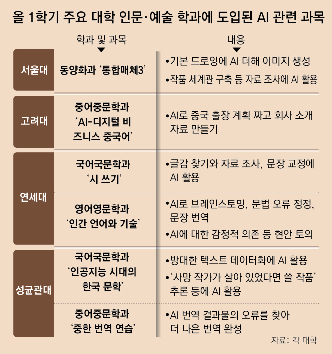서울대와 고려대, 연세대 등 주요 대학의 어문·예술 계열 학과들이 3월 새 학기부터 인공지능(AI)을 정규 교과 과목에 적극 도입하는 것으로 4일 나타났다. 그간 AI를 악용한 커닝이나 과제 대필을 막는 데 집중했던 대학가가 이제는 AI를 필수 도구로 받아들이기 시작한 것. 특히 통번역이나 미술 등 사람의 일자리가 빠르게 위협받는 분야일수록 AI와의 공존을 통한 생존법을 모색하고 있다는 분석이 나온다.