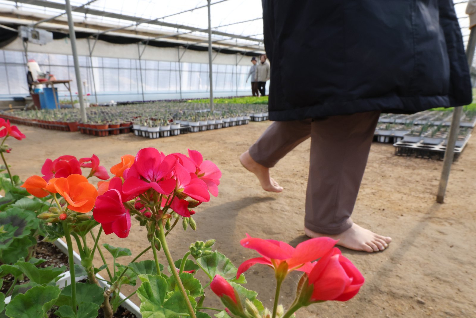 절기상 입춘(立春)을 닷새 앞둔 30일 경기 안양시 동안구 비산3동 꽃양묘장 비닐하우스 안에서 시민들이 신발을 벗고 맨발로 흙길을 걷고 있다. 2026.1.30 뉴스1
