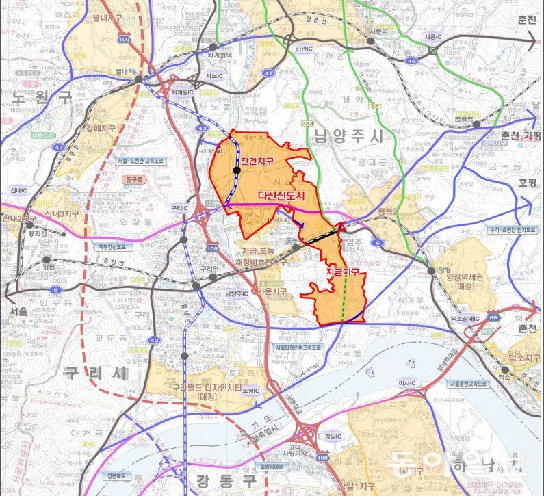 다산신도시의 출발은 순탄치 않았다. 경의·중앙선 개통으로 서울 접근성이 개선되자 한국토지주택공사(LH)가 남양주 지금도농뉴타운 재개발사업을 추진했지만 사업비 조달 문제 등으로 추진에 난항을 겪었다. 이후 2010년 경기도가 사업을 넘겨받아 공공 주도의 주택지 개발로 방향을 전환했고, GH가 시행을 맡아 분산돼 있던 진건·지금 보금자리주택지구를 하나의 신도시로 통합해 개발을 진행했다. 도시 이름은 남양주 출신 실학자인 다산 정약용 선생(1762~1836)의 호에서 따왔다.