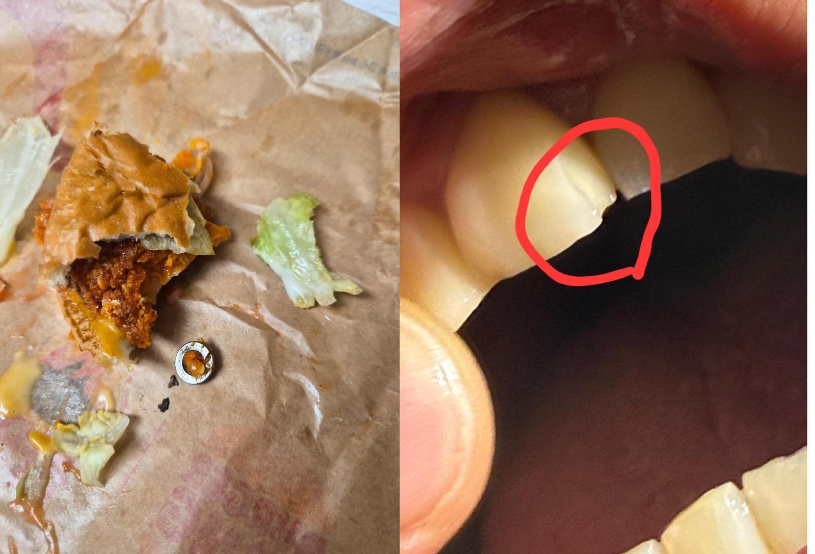 사연자는 위쪽 앞이빨 끝에 금이 가고 부서져 있는 사진과 햄버거 안에서 나온 것으로 추정되는 원형 볼트 사진을 올렸다.