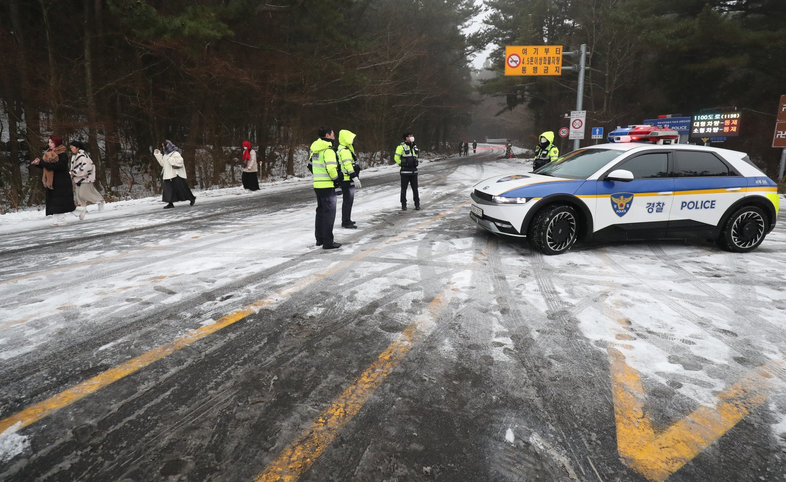 제주도 산지에 대설주의보가 내려진 2일 오전 제주 한라산을 통과하는 1100도로 입구인 제주시 어승생 삼거리에서 제주서부경찰서 소속 경찰관이 도로통제를 하고 있다. 2026.02.02 뉴시스