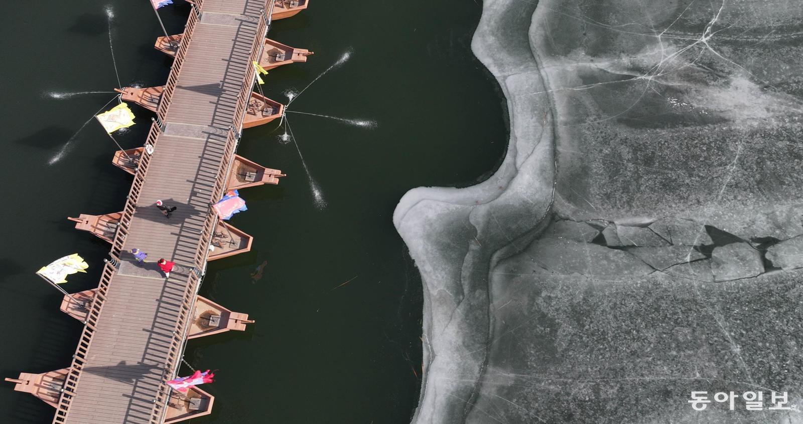 6일 경기 양평군 지방정원 세미원 인근 북한강이 일부 얼어 있다. 주말 내내 전국적인 한파가 이어지는 가운데 중부 내륙을 중심으로는 영하 15도 안팎까지 기온이 떨어질 것으로 보인다. 7일 아침 최저기온은 영하 17도∼영하 2도, 8일에는 영하 18도∼영하 5도로 예보됐다.