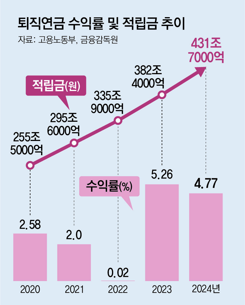 노사정이 추진하는 기금형 퇴직연금은 확정기여(DC)형에만 도입된다. 2024년 기준 총적립금의 26.8%를 차지하는 확정기여형은 현재 대부분 계약형으로 근로자가 개별적으로 상품을 선택하고 운용해 왔다. 투자 정보가 부족한 탓에 위험이 낮은 은행 예·적금 등 원리금 보장 상품에 묶인 경우가 많아 수익률이 낮았다.
