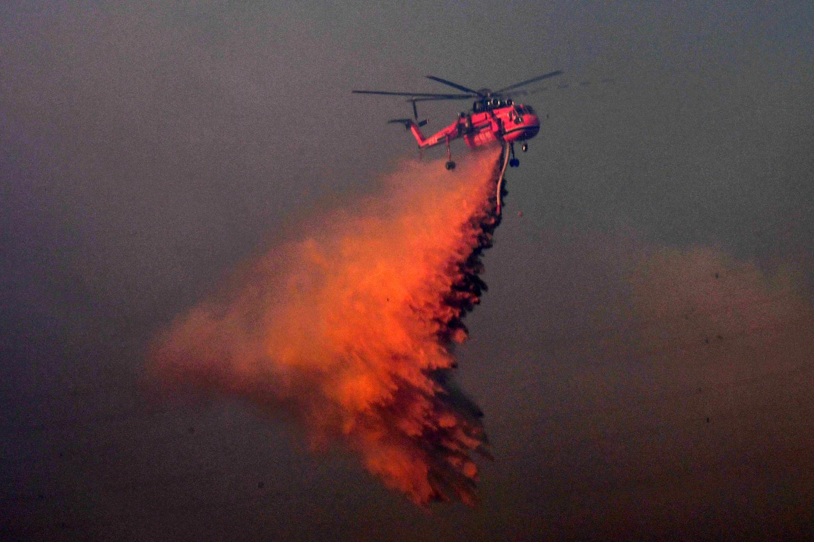 8일 경북 경주시 문무대왕면 입천리에서 발생한 산불이 강풍을 타고 확산되고 있는 가운데 산림청 초대형헬기(S-64) 헬기가 송전선로를 피해 진화 작업을 벌이고 있다. 이날 오후 정부는 신속한 진화를 위해 국가소방동원령을 발령했다. 2026.2.8.뉴스1