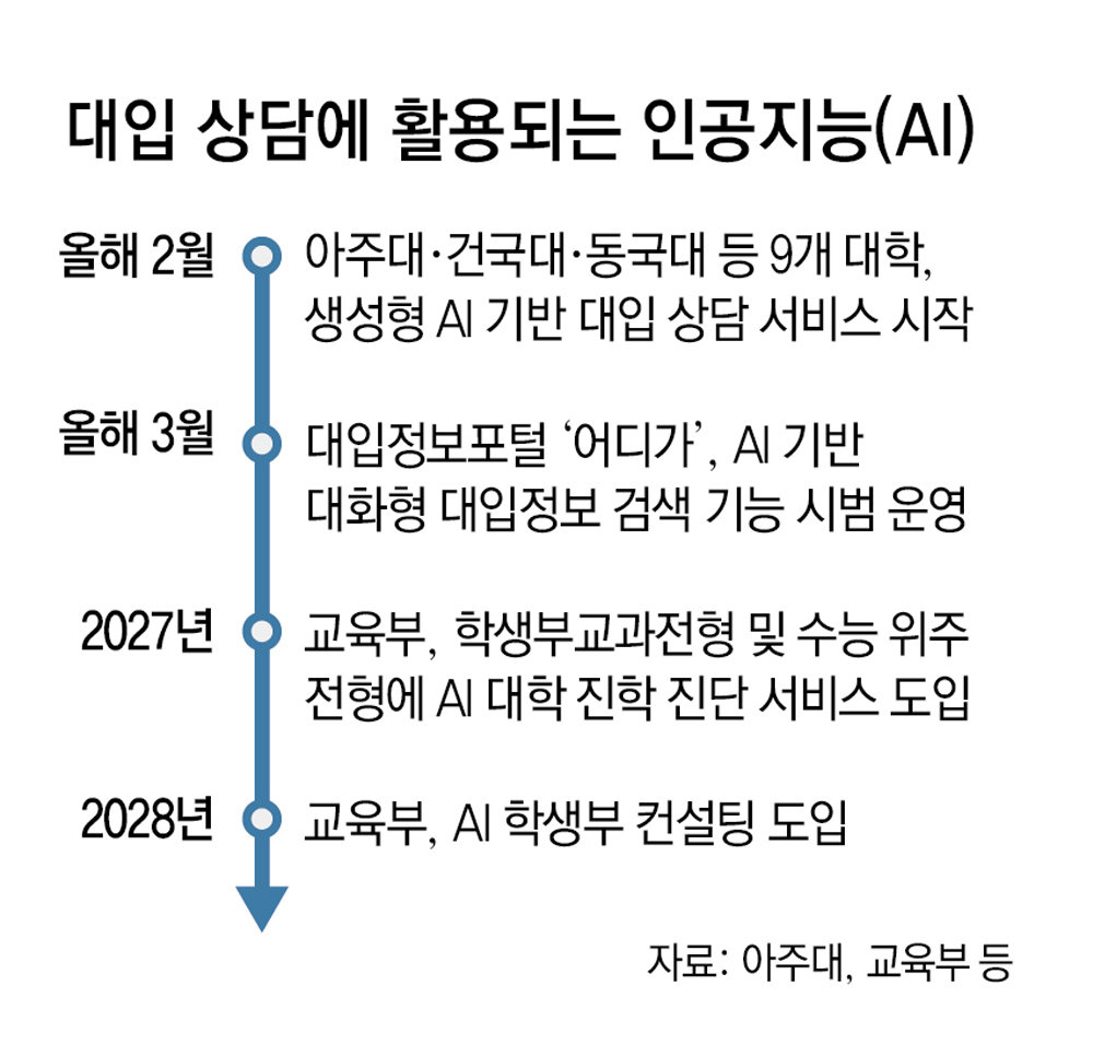 하지만 AI 대입 상담 서비스가 확대되면 정보 불균형을 해소하는 데 큰 도움이 된다는 게 전문가들의 공통된 의견이다. 대입 전형이 복잡해 각 대학 입학처는 입시 철마다 수험생들의 전화 문의에 시달리느라 점심시간을 거를 정도다. 고지영 아주대 책임입학사정관은 “AI를 통해 학생이 서울 대치동에 살든 섬에 살든 똑같은 입시 정보를 비용 없이 제공받을 수 있다”고 했다.