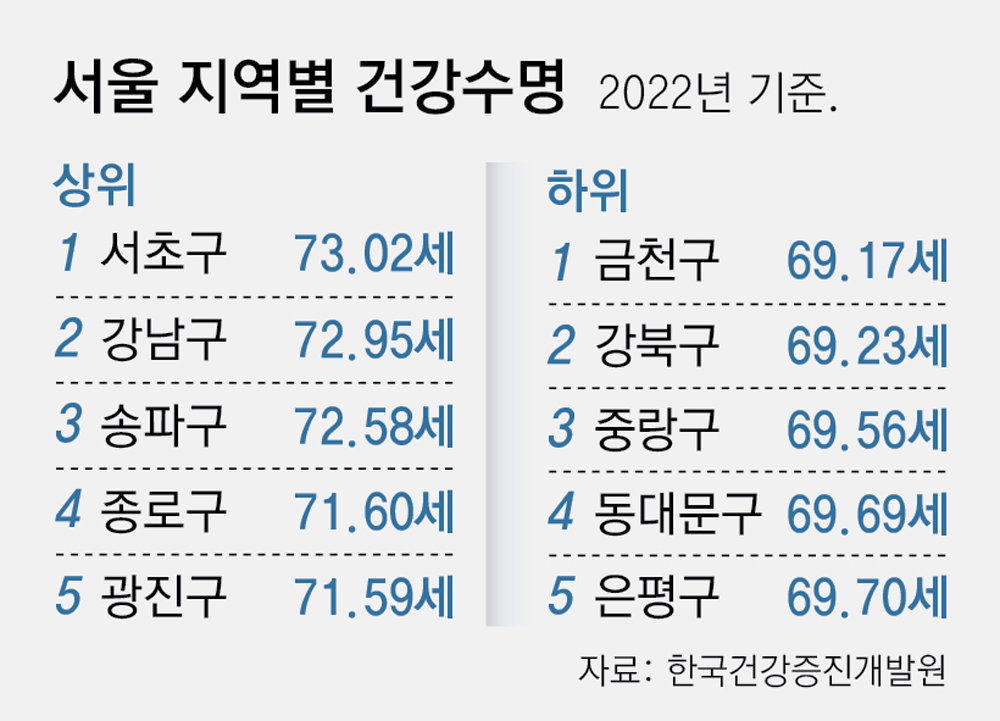 서울 안에서도 자치구별로 건강수명 격차가 컸다. 2022년 기준 서울에서 강남 3구(서초·강남·송파구)의 건강수명은 각각 73.02세, 72.95세, 72.58세로 1∼3위를 차지했다. 건강수명이 가장 높은 서초구와 가장 낮은 금천구(69.17세)는 4세 가까운 격차가 났다.