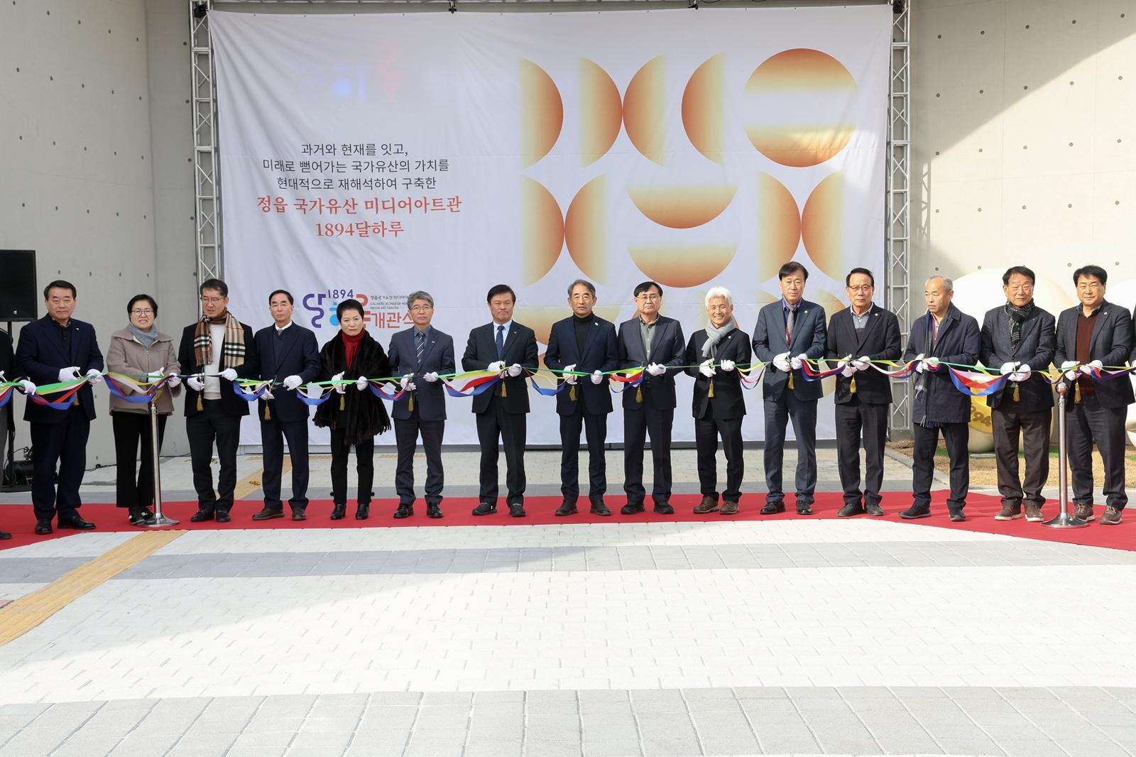 전북 정읍시 부전동에 조성된 복합 전시 공간 ‘정읍 국가유산 미디어아트관 1894 달하루’ 개관식에서 참석자들이 테이프 커팅을 하고 있다. 정읍시 제공