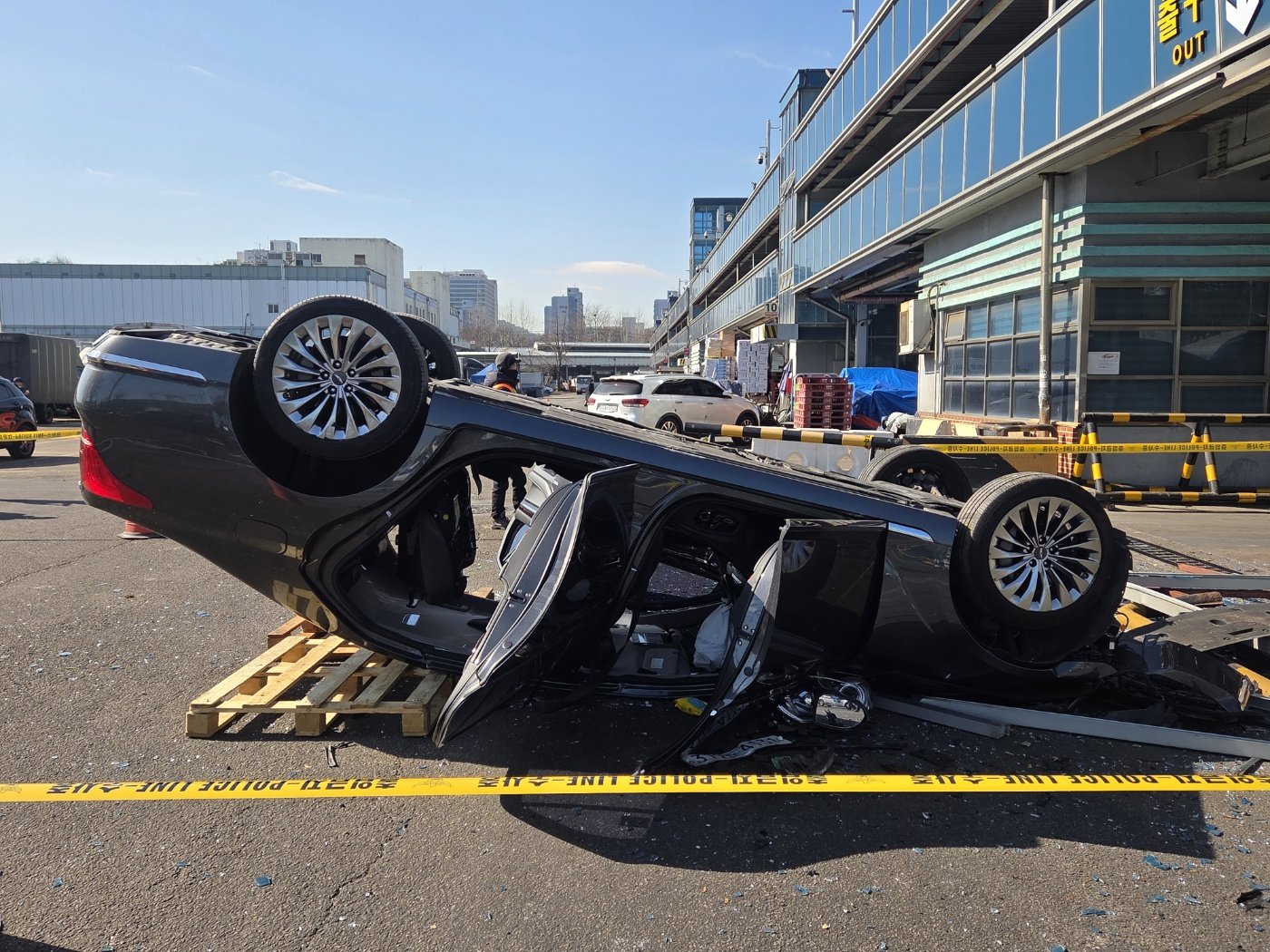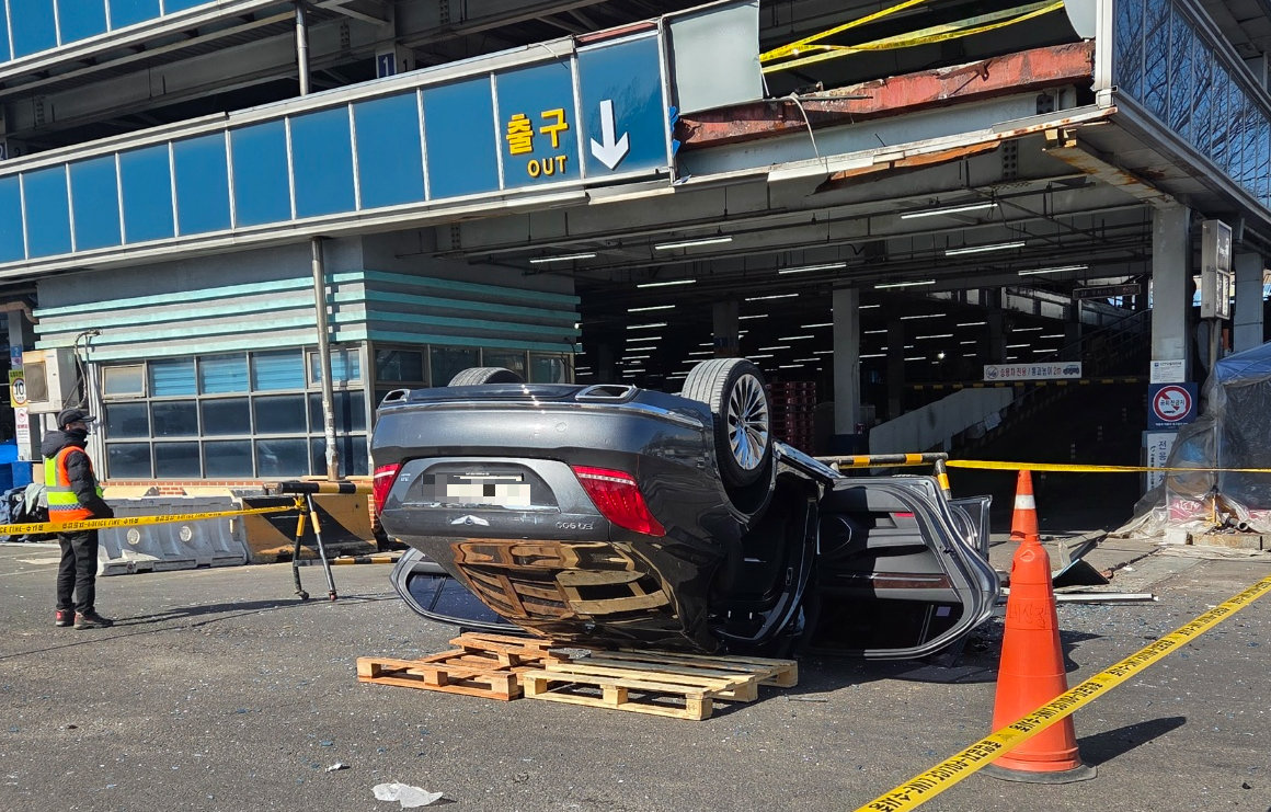 사고 현장에서 확인한 주차장 건물은 2층 외벽과 창문 등이 파손돼 떨어져 나간 상태였다. 추락한 차량은 번호판이 심하게 구겨졌고 사이드미러와 앞 범퍼, 문짝 등이 크게 파손돼 있었다.