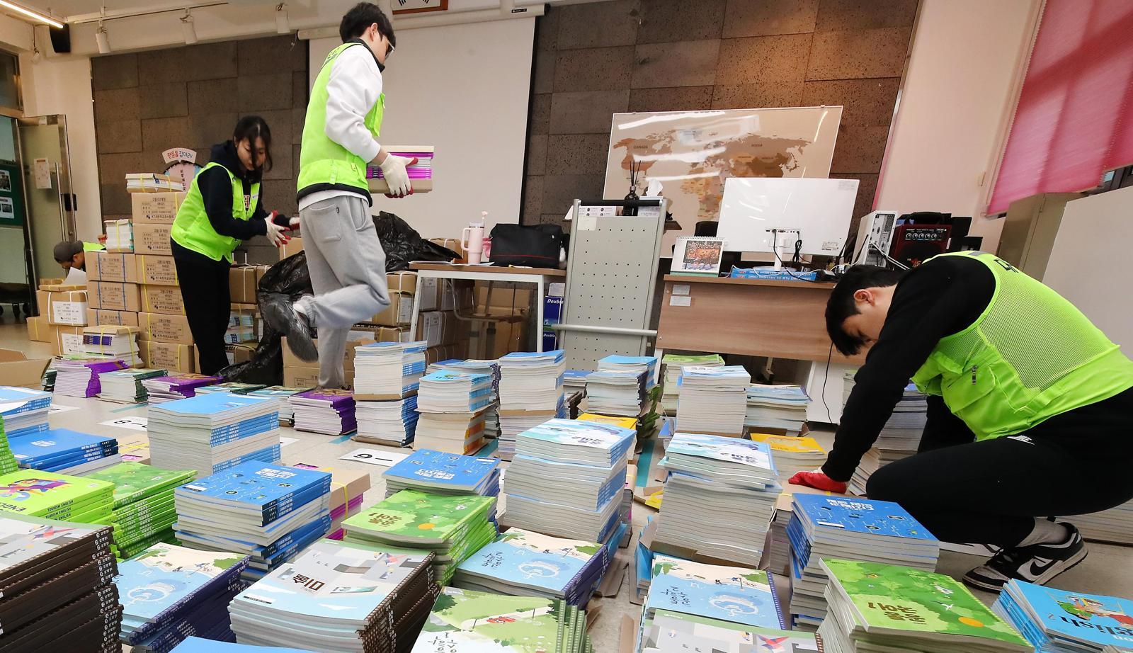 9일 대구 동구 신암동 대구관광고에서 직원들이 개학을 앞두고 학생들에게 나눠줄 올해 신학기 교과서를 분류하고 있다.