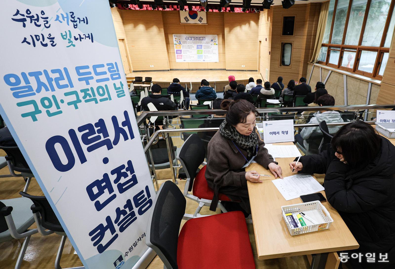 9일 오후 경기도 수원시 영통구 태장마루도서관에서 열린 ‘일자리 두드림 구인·구직의 날’ 행사에서 구직자들이 면접을 보고 있다. 이날 행사에는 5개 업체가 참여해 총 18명을 채용할 예정이다.