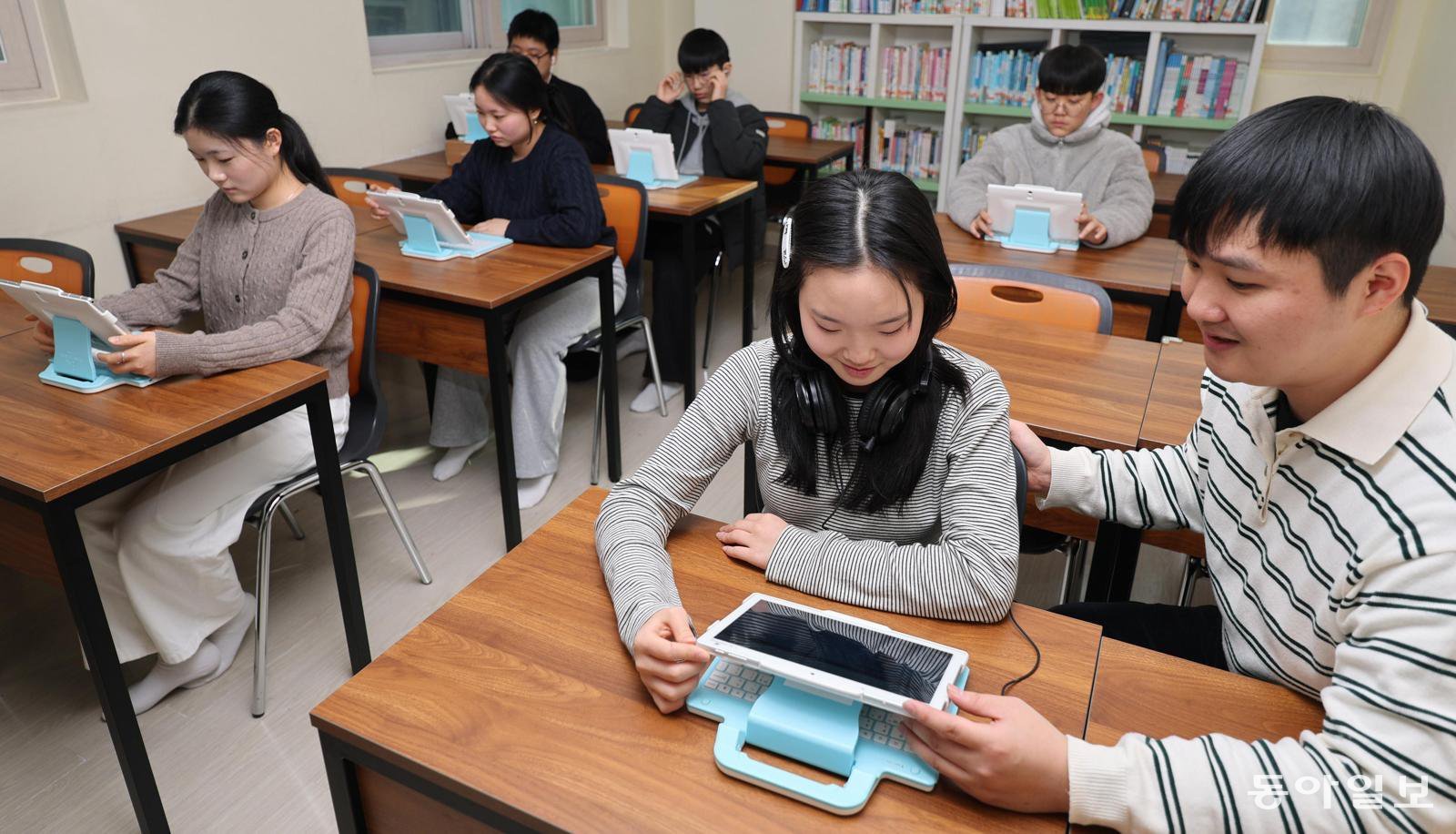 6일 서울 은평구 갈현지역아동센터에서 학생들이 센터 교사의 지도를 받으며 태블릿 PC로 ‘서울런’ 강의를 학습하고 있다. 서울시는 지역아동센터 학생 전원을 대상으로 서울런 이용 대상을 확대하는 시범사업을 추진하고 있다. 장승윤 기자 tomato99@donga.com