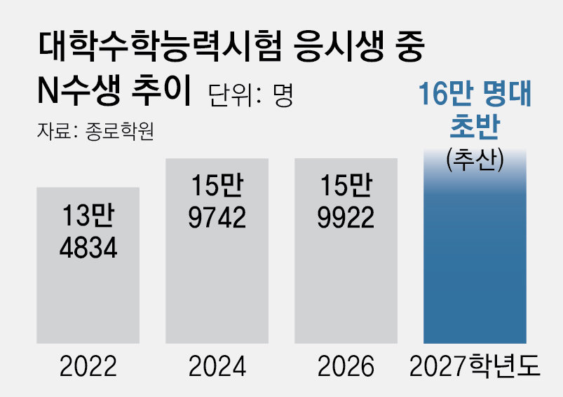 역대급 ‘불수능’으로 올해 정시 모집 탈락자가 대폭 늘어난 가운데 2027학년도 대학수학능력시험(수능)에 도전하는 ‘N수생’(대학 입시에 두 번 이상 도전하는 수험생)이 16만 명을 넘어설 것이라는 전망이 나왔다. 최근 20년 동안 졸업생 수능 응시자가 16만 명을 넘긴 것은 2005학년도와 2025학년도 등 두 번뿐이다. 내년 의대 정원 확대와 지역의사제 전형 도입, 불수능 여파 등이 졸업생의 수능 재도전을 이끄는 것으로 분석된다.