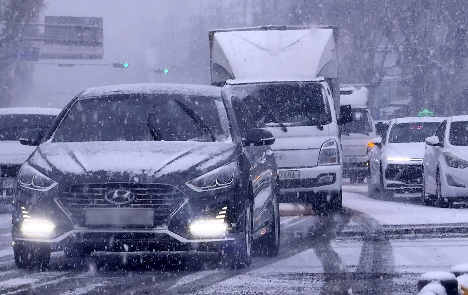 밤사이 많은 눈이 내린 2일 오전 대구 신천동로에서 꼬리를 문 차량이 서행하며 거북이운행을 하고 있다. 2026.2.2 뉴스1