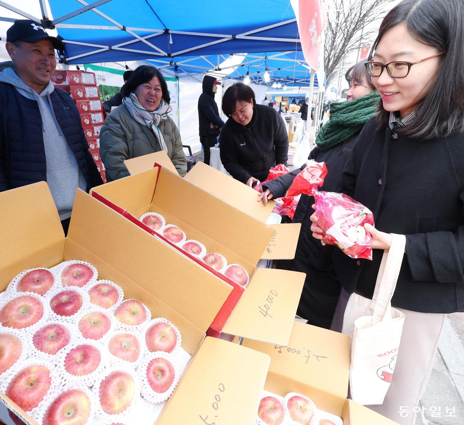 10일 서울 송파구청 앞에서 열린 ‘설맞이 농수산물 직거래장터’에서 한 시민이 사과를 고르고 있다. 송파구는 설 명절을 앞두고 지역 상권 활성화와 구민 장보기 편의를 위해 이날부터 이틀간 구청 인근에서 직거래 장터를 운영한다.