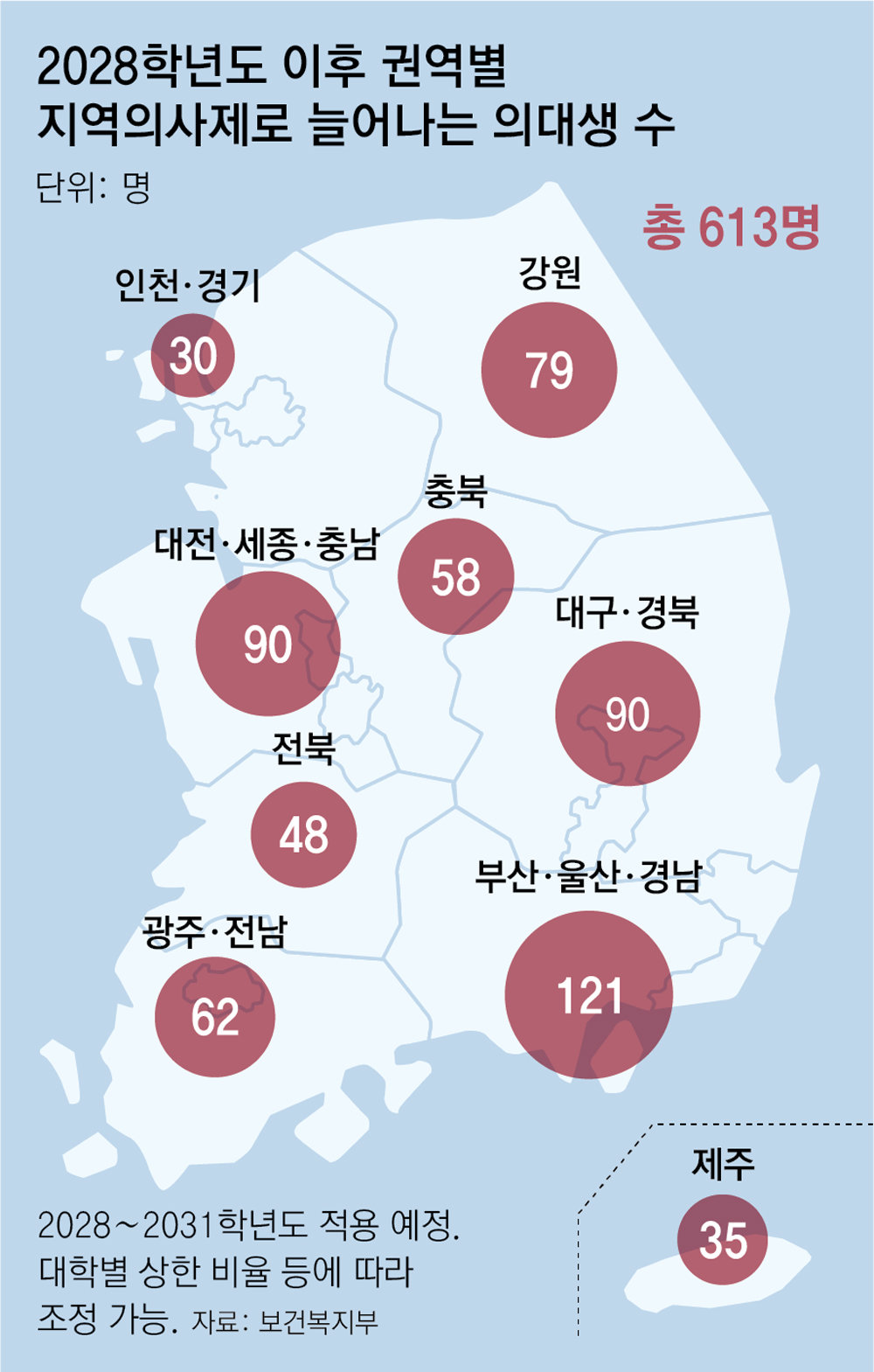 정부는 정원 50명 미만 국립대 의대 위주로 증원 인원을 배분할 계획이다. 강원대·충북대(각 49명)와 제주대(40명)는 기존 정원의 최대 두 배까지 증원할 수 있다. 정원 50명 미만의 사립 의대는 30%까지, 50명 이상은 20%까지 증원이 가능하다.