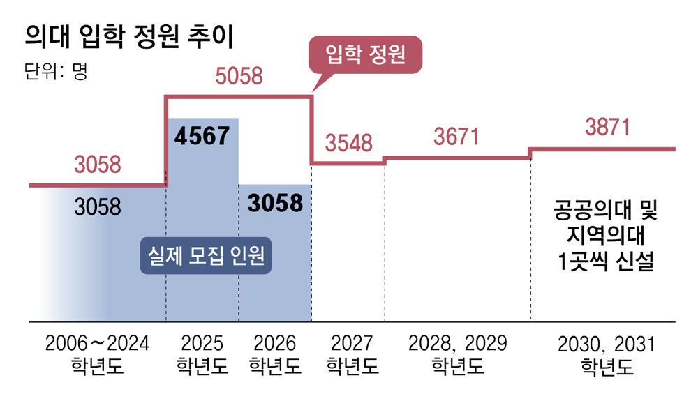 정부가 내년부터 2031학년도까지 5년간 의대 정원을 총 3342명, 연평균 668명씩 늘리는 방안을 확정하며 의대 증원에 다시 시동을 걸었다. 앞서 윤석열 정부는 과학적 근거와 사회적 합의 과정 없이 ‘5년간 1만 명 증원’을 추진했다가 2년간 극심한 의정 갈등을 불러왔다.