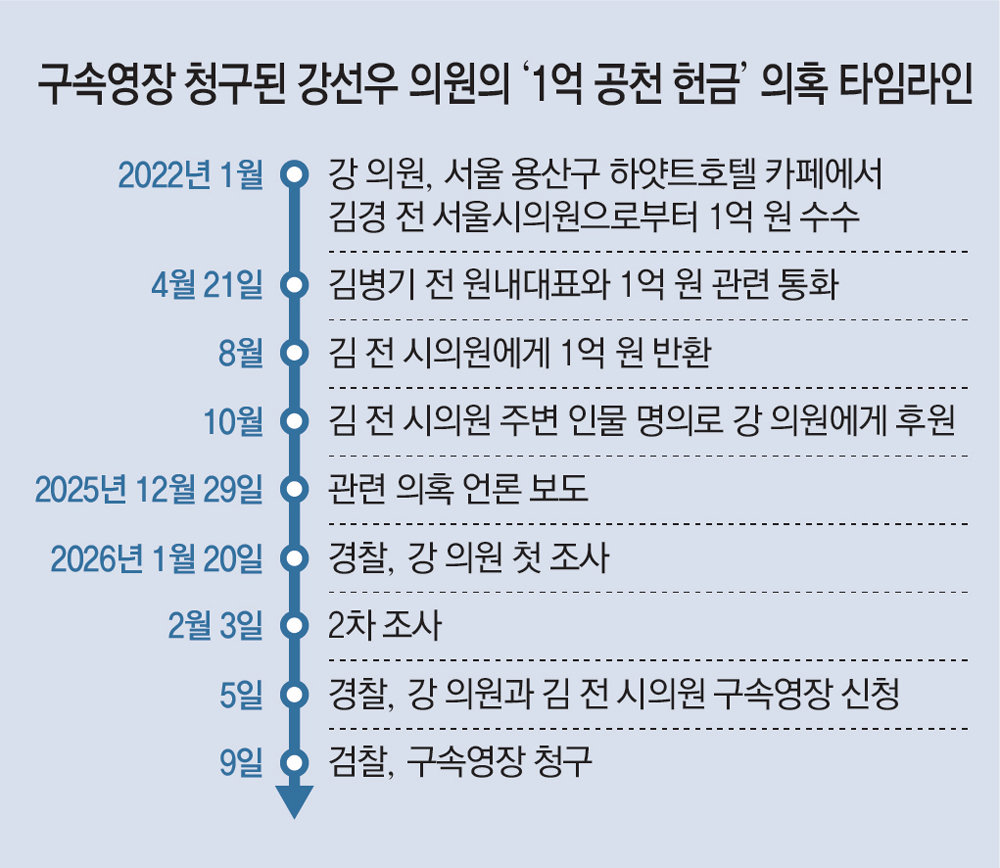 서울경찰청 공공범죄수사대가 9일 검찰을 통해 청구한 20여 쪽 분량의 구속영장에는 강 의원이 2022년 1월 서울 용산구 하얏트호텔 카페에서 김 전 시의원으로부터 1억 원을 받았다는 범죄 사실이 적시됐다. 강 의원은 당시 쇼핑백에 돈이 든 줄 몰랐고 그해 4월 20일경 알게 됐다고 주장해 왔다. 하지만 경찰은 “쇼핑백을 건네기 전 강 의원의 전직 사무국장 남모 씨가 ‘한 장(1억 원)’을 요구했다”는 김 전 시의원의 진술, 쇼핑백을 주고받을 당시의 상황 등을 고려할 때 강 의원의 주장에 신빙성이 낮다고 결론 낸 것으로 전해졌다.
