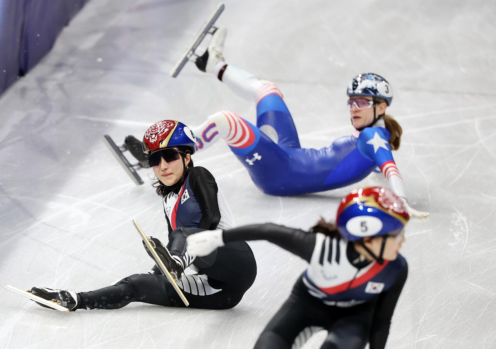 쇼트트랙 대표팀 김길리가 10일(현지시간) 이탈리아 밀라노 아이스 스케이팅 아레나에서 열린 2026 밀라노·코르티나담페초 동계올림픽 쇼트트랙 혼성 2000m 계주 준결승에서 미국 선수와 충돌하고 있다. 2026.2.10 뉴스1