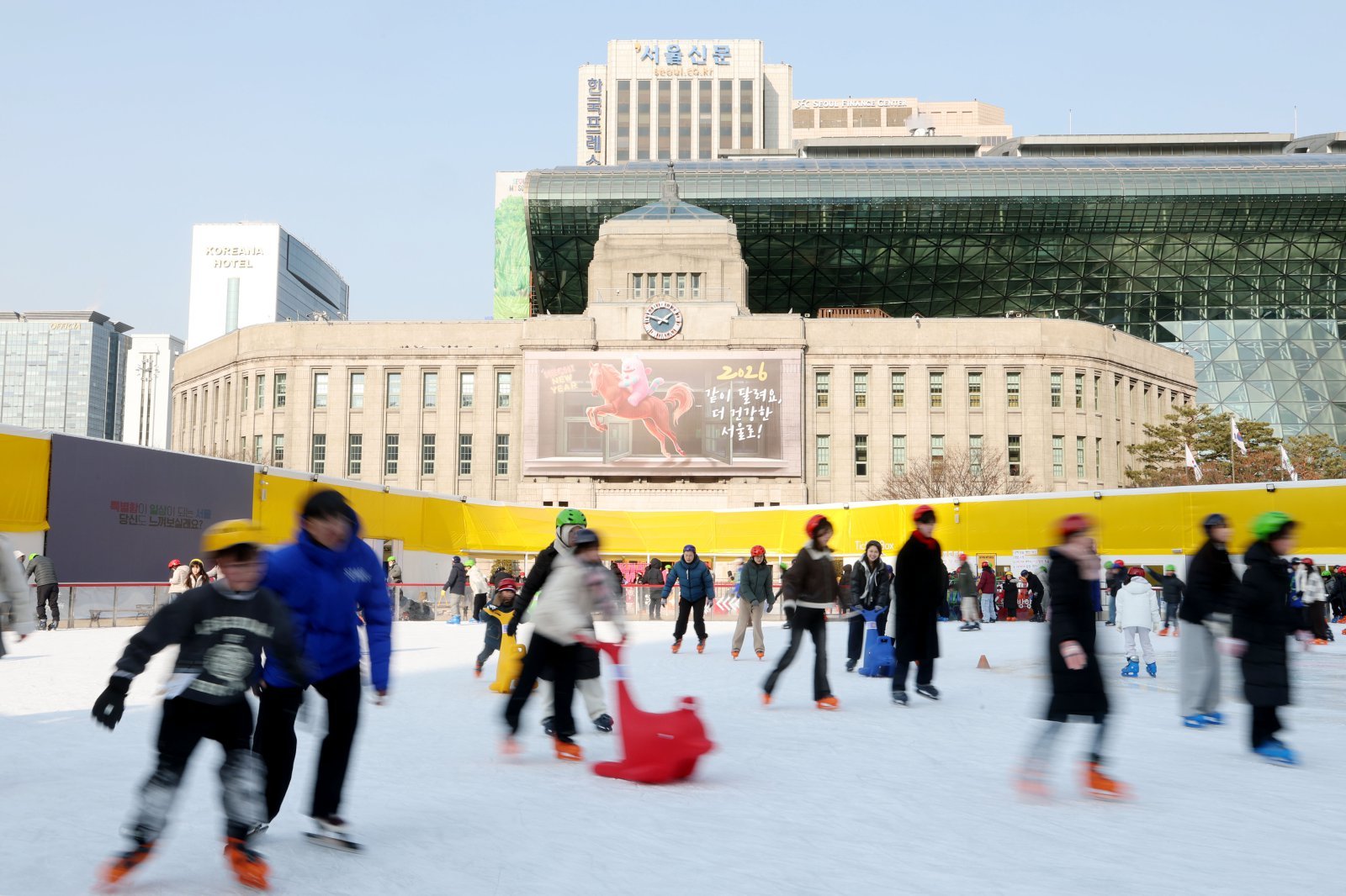 14일 오후 서울 중구 서울광장 스케이트장을 찾은 시민들이 스케이트를 타며 즐거운 시간을 보내고 있다. 이날 서울시에 따르면 서울광장 스케이트장 이용객이 개장 26일 만에 10만명을 돌파했다. 2026.1.14 뉴스1