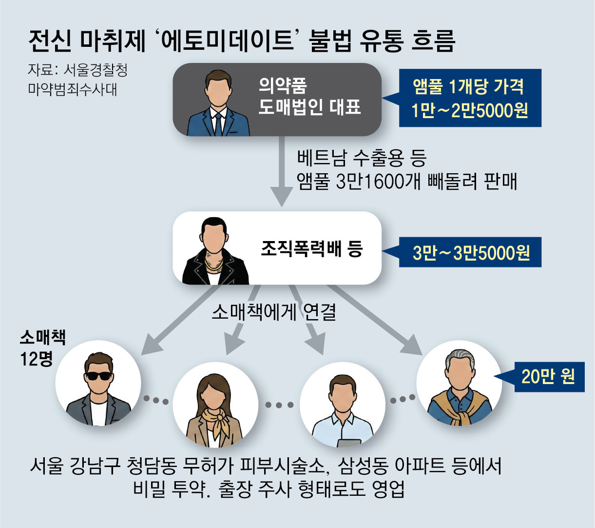 ‘실장님’이라고 불린 한 소매업자는 청담동에 피부과 클리닉을 연상케 하는 간판과 인테리어를 갖춘 뒤 가짜 의사를 고용해 1회당 20만 원을 받고 에토미데이트를 투여했다. 보안 메신저로만 예약을 받아 단속을 피했다. 또 다른 업자는 투약 장소 노출을 막기 위해 서울 강남 일대의 아파트나 빌라를 단기 임차해 ‘떴다방’식으로 운영하며 전용 차량으로 고객을 실어 날랐다. 이 일당은 주거지에 방문하는 ‘출장 주사’ 서비스까지 운영했다. 최근 연예인 불법 수액 주사로 논란이 된 ‘주사 이모’와 비슷한 형태다.