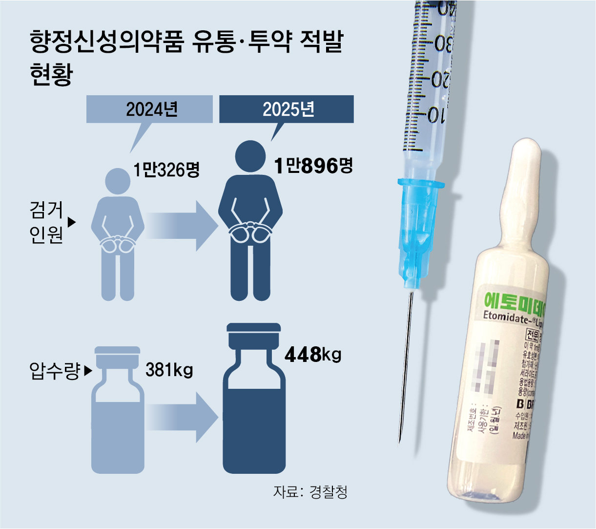 경찰은 관세청, 식약처 등과 함께 이 같은 신종 마약류를 특별 단속하기로 했다. 경찰청에 따르면 향정신성의약품(마약류)을 유통하거나 투약해 적발된 인원은 2024년 1만326명에서 2025년 1만896명으로 늘었고 같은 기간 압수량도 381kg에서 448kg으로 17.6% 증가했다.