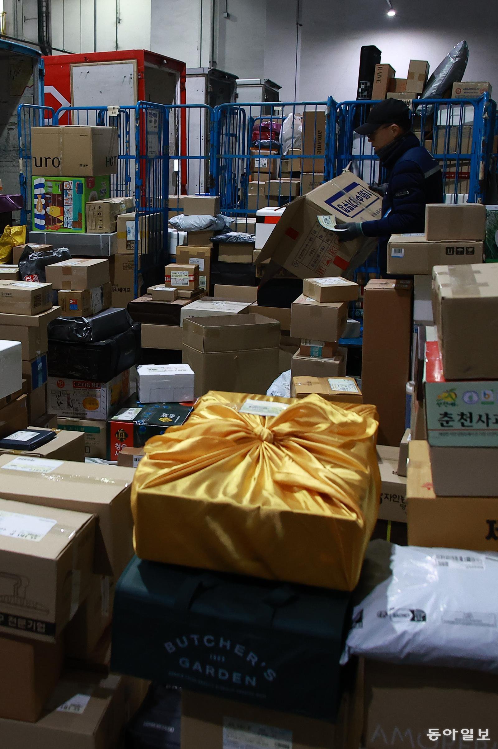 설 명절을 앞둔 11일 오전 서울 송파구 남동복합물류센터에서 작업자가 쌓여 있는 설 선물 등 택배 물품을 분류하고 있다.