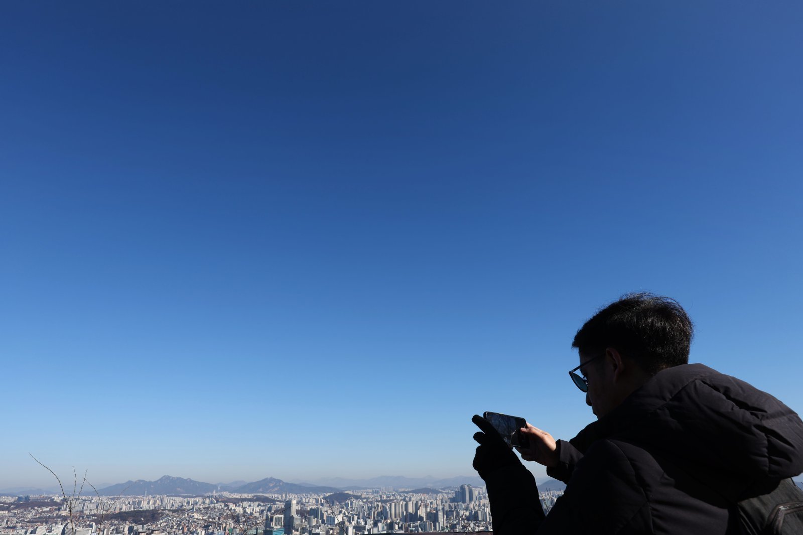 전국이 대체로 맑은 날씨를 보인 15일 서울 중구 남산을 찾은 관광객이 스마트폰으로 파란 하늘과 서울 도심을 담고 있다. 2024.01.15. 서울=뉴시스