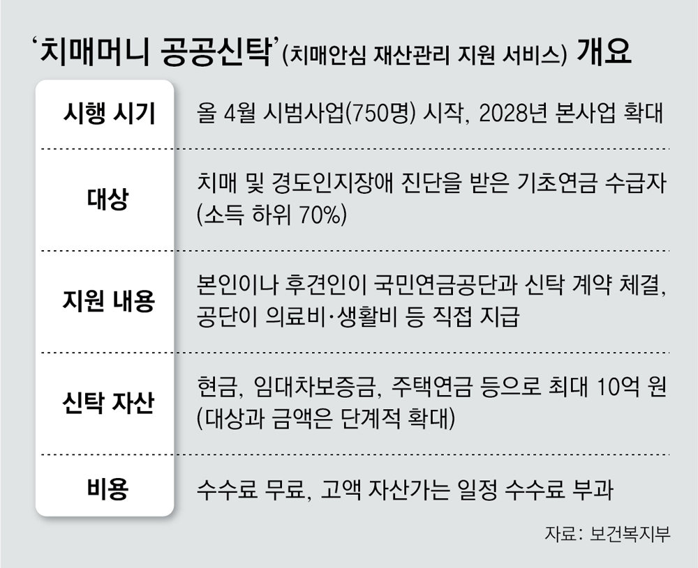 정부가 12일 발표한 제5차 치매관리 종합계획(2026∼2030년)에 따르면 올 4월부터 국민연금공단이 운영하는 ‘치매머니 공공신탁’(치매안심 재산관리 지원 서비스)이 도입된다. 공단이 치매 환자나 후견인과 신탁 계약을 맺고 현금, 임대차보증금, 주택연금 등의 현금성 자산을 관리해 주는 것이다. 신탁 재산은 향후 단계적으로 부동산 등으로 확대할 방침이다.