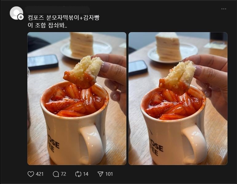 실제 소비자들의 반응도 뜨겁다. 스레드 등 SNS상에서는 “카페에서 떡볶이를 파는 게 신선하다”, “아메리카노와 떡볶이 세트가 5900원이라 가성비가 좋다”는 후기가 이어지고 있다. 특히 “분모자 떡볶이에 감자빵을 찍어 먹는 조합이 의외로 잘 어울린다”는 등 소위 ‘꿀조합’ 후기들이 공유되며 입소문을 타고 있다.